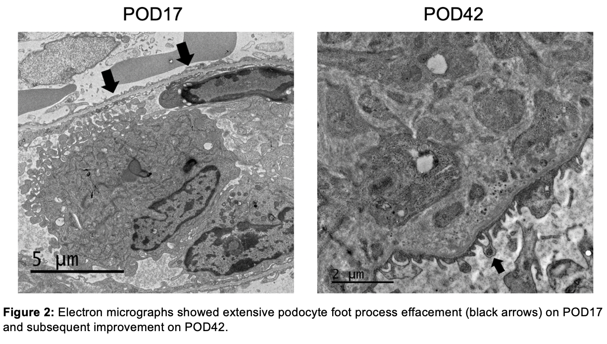 Results: The xenograft functioned immediately. Serum creatinine (SCr) decreased from 7.6 mg/dL to 1.0 mg/dL within 72 hours. Electron microscopic (EM) examination of a protocol biopsy on POD 9 demonstrated intact podocyte foot processes with no evidence of glomerular basement membrane (GBM) remodeling or electron-dense immune deposits. Within the first two weeks, the mean urine protein/creatinine (u p/cr) was 1.3 ± 0.44 g/g. On POD 17, although SCr remained stable at 1.0 g/dL, the u p/cr acutely increased to 12.7 g/g (Fig.1), prompting a biopsy. EM revealed near total foot process effacement (Fig.2). Since a circulating factor or podocyte-specific xeno-antibody-associated focal and segmental glomerulosclerosis could not be ruled out, five sessions of therapeutic plasma exchange (PLEX) were initiated. This resulted in a decrease in u p/cr to 0.9 g/g within 72 hours. The u p/cr averaged 0.98 g/g until POD 33, when it acutely increased to 9.9 g/g. PLEX again improved u p/cr to 1.1 g/g. After this, the patient had variable but significant proteinuria (5.8 ± 5.8 g/g), though her graft function remained excellent with a stable SCr of 1.59 ± 0.32 mg/dL. However, on POD 127, she presented with an acute rise in SCr to 10.3 mg/dL in the setting of decreased immunosuppression due to infection. She was diagnosed with acute rejection resulting in xenograft failure. The increase in u p/cr in the final days noted in Fig.1 likely represents a significant overestimate since the urine samples were obtained during oliguric acute kidney injury.