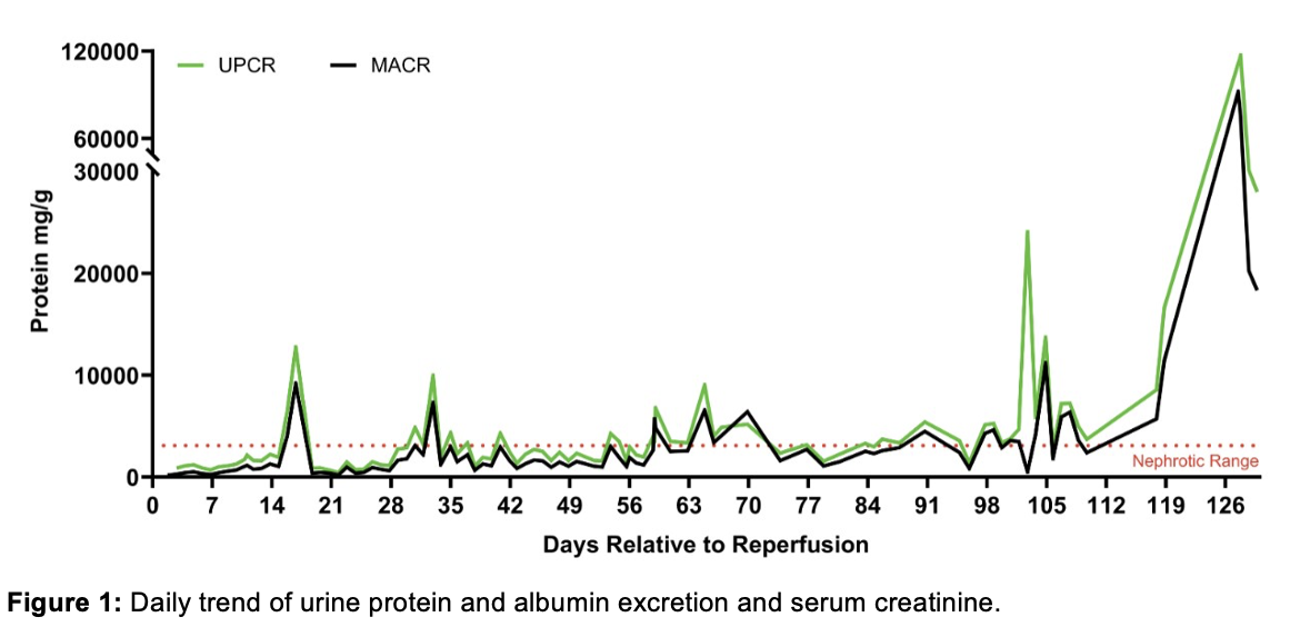 Conclusion: We report episodic nephrotic range proteinuria in the longest-functioning pig-to-human kidney transplant. Proteinuria was initially responsive to PLEX and did not impede graft function. Further studies are needed to elucidate the etiology of proteinuria, which may include antibody-mediated rejection, immune complex-mediated glomerulonephritis, or podocyte-specific xeno-antibodies. Determining the mechanism of injury to the filtration barrier holds the key to developing targeted therapies aimed at preventing or reversing proteinuria should it occur.