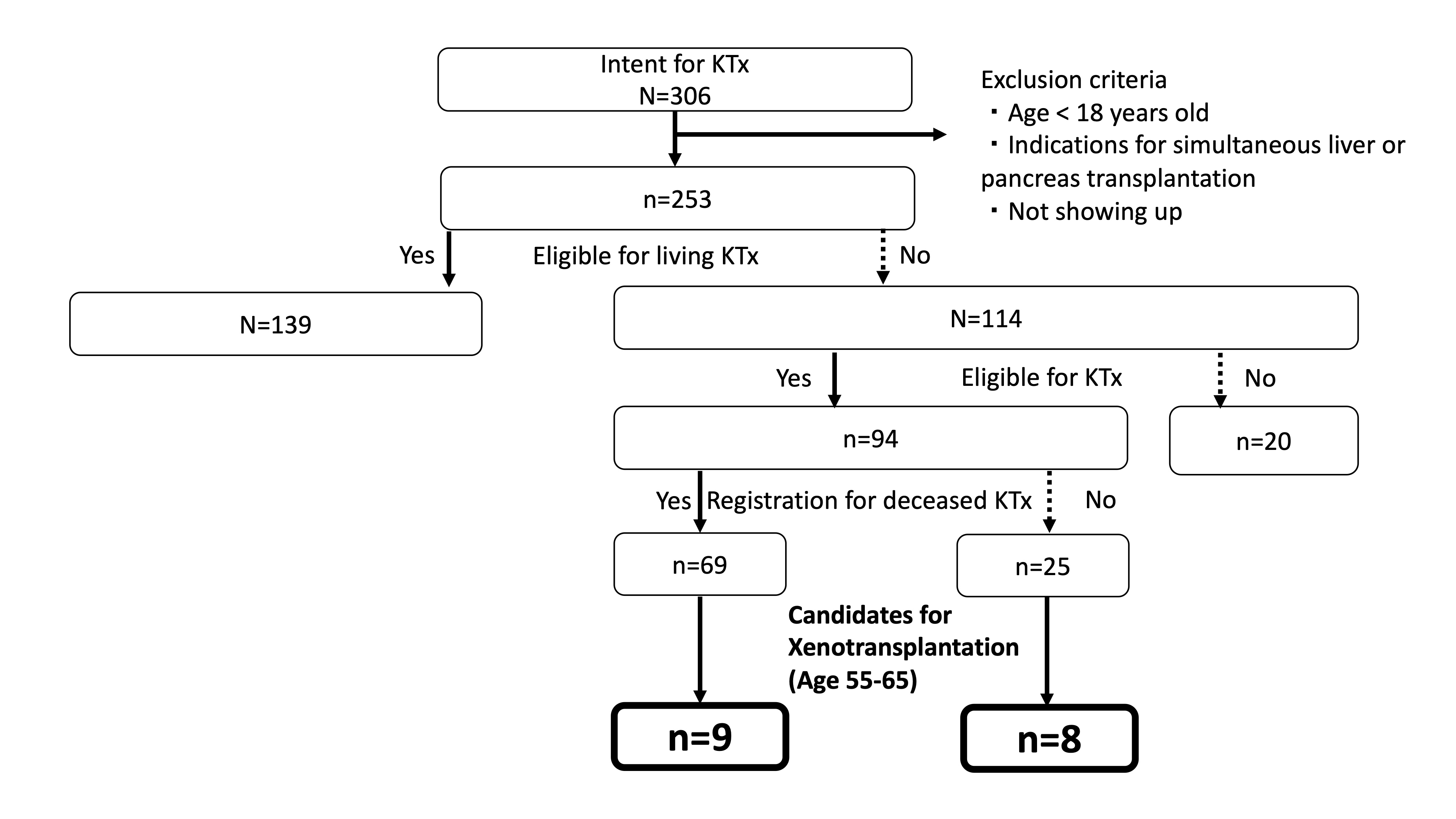 Methods: Two hundred fifty-three patients who presented to our facility from 2016 to 2023 were enrolled in this study. Exclusion criteria were age under 18 years old, indications for simultaneous liver or pancreas transplantation, or those who did not show up before a clinical decision was made. The number of patients at age 55-65 years old who are supposed to be potential candidates for xenotransplantation were evaluated out of the patients who were ineligible for living kidney transplantation.