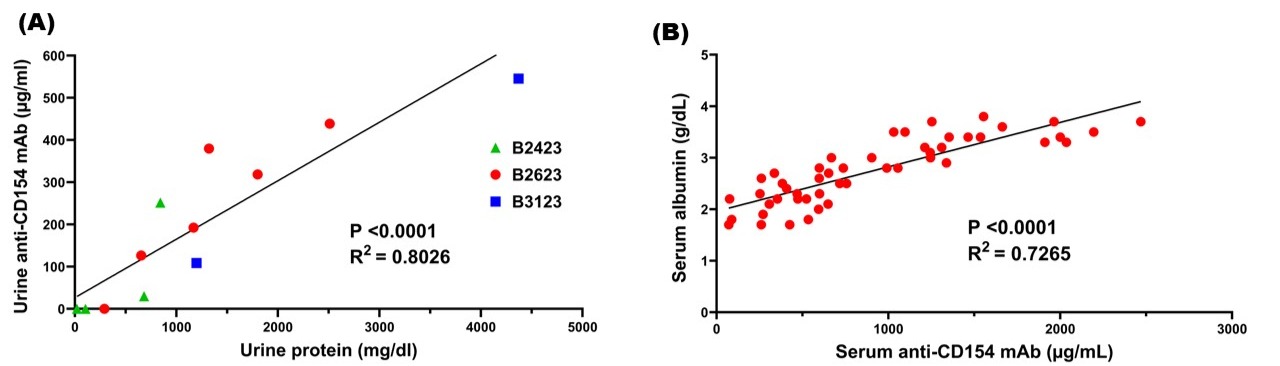 Results: Four of nine recipients who survived beyond four months developed persistent nephrotic-range proteinuria (urine protein-to-creatinine ratio >3.5g/g). However, all four maintained normal or near-normal serum creatinine levels for weeks to months. Histopathological analysis of these grafts revealed focal glomerular thrombotic microangiopathy (4/4), transplant glomerulopathy (3/4), focal segmental glomerulosclerosis (2/4), or membranous nephropathy (1/4), without classical features of xenograft rejection. Proteinuria correlated with urinary loss of therapeutic antibodies (Figure 1A), and low serum albumin levels were associated with reduced trough levels of anti-CD154mAb (Figure 1B).