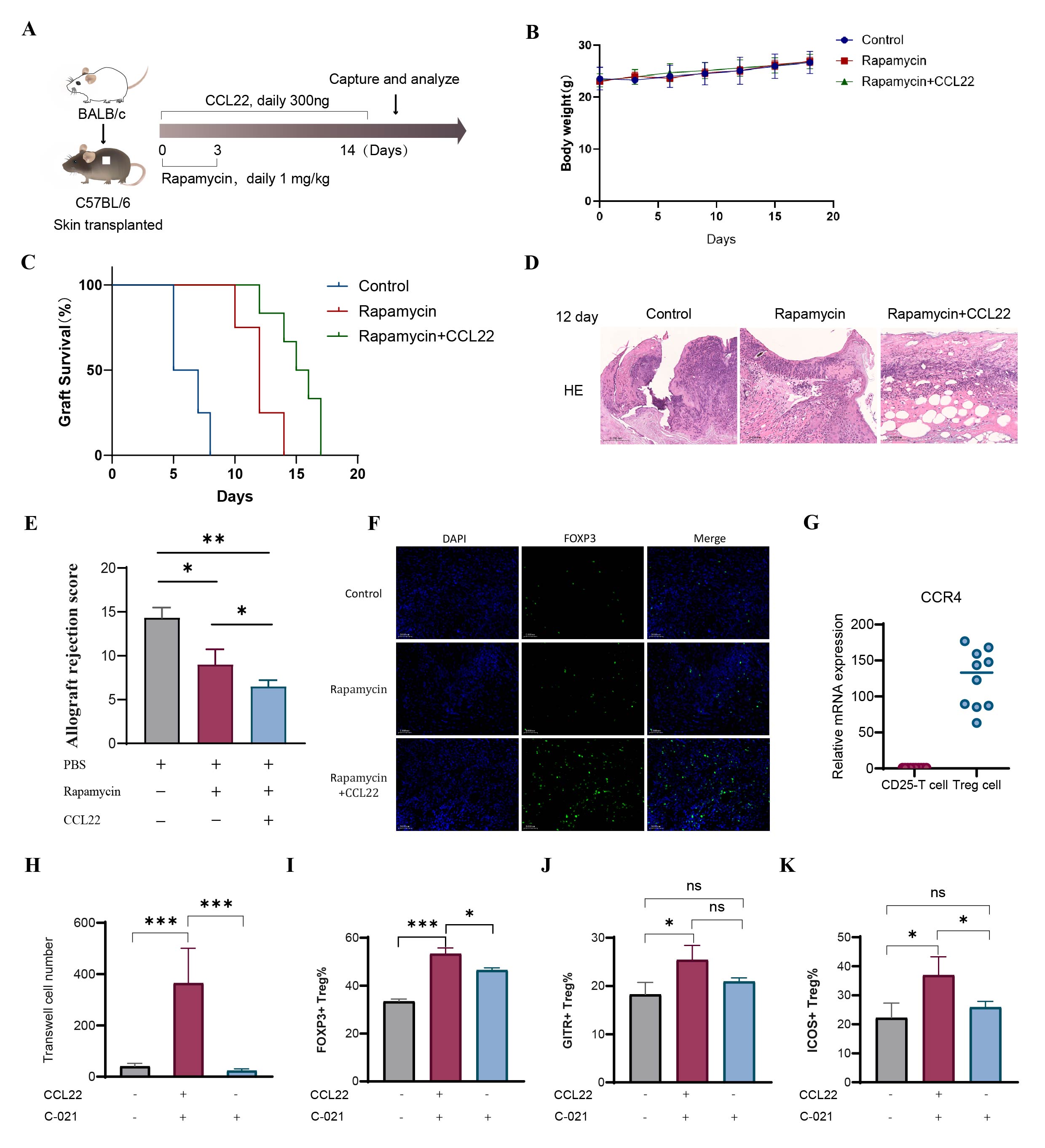 Methods: We established a murine allogeneic skin transplantation model, performing graft rejection scoring across different experimental groups. Grafts were analyzed using H&E staining, immunohistochemistry, immunofluorescence, and ELISA. In vitro, the function of CCL22 was assessed through mixed lymphocyte reaction (MLR) assays, flow cytometry, and ELISA. Mechanistic insights were obtained by blocking the CCR4 receptor. Additionally, MSCs overexpressing CCL22 (CCL22-OE MSCs) were generated and subcutaneously transplanted into mice, with subsequent analyses of the transplantation sites.