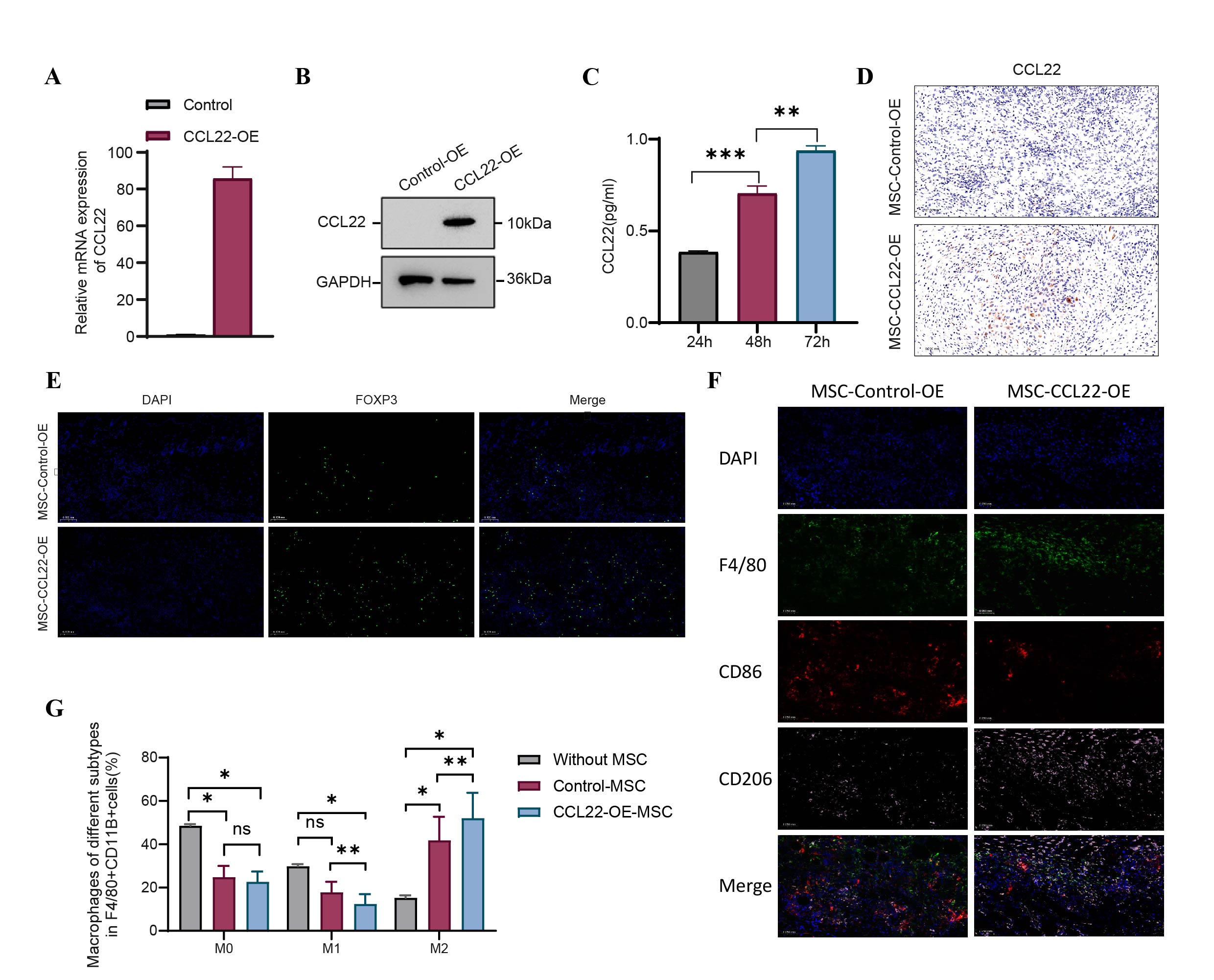 Results: CCL22 markedly prolonged graft survival, reduced inflammation, enhanced regulatory T cell (Treg) infiltration, and lowered rejection scores in the mouse model. In vitro assays showed CCL22 efficiently recruited Tregs. MLR assays demonstrated that CCL22 increased Tregs' suppressive capabilities against T-cell proliferation. Flow cytometry revealed CCL22 upregulated Treg-specific transcription factor FOXP3 and surface markers GITR and ICOS. ELISA indicated that CCL22 treatment elevated production of immunoregulatory cytokines IL-10 and TGF-β, alongside promoting Ca²⁺ influx. Mechanistically, these effects depended on the CCR4 receptor, as demonstrated by the loss of Treg recruitment and function upon administration of CCR4 antagonist C-021. Immunofluorescence analyses showed that subcutaneous transplantation of CCL22-OE MSCs significantly enhanced local Treg recruitment, markedly decreased M1 macrophages, and increased M2 macrophages. Additionally, in vitro co-culture experiments revealed that CCL22-OE MSCs induced macrophage polarization toward the M2 phenotype.