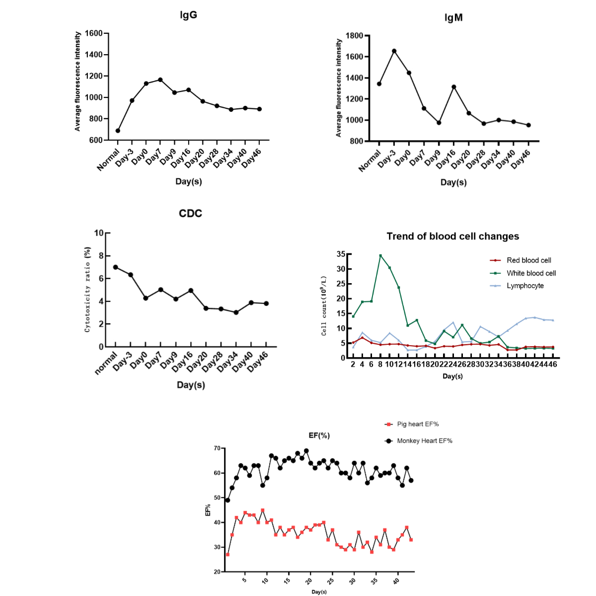 Results: The rhesus macaque survived 46 days post-transplant with stable function of the transplanted heart and no signs of hyperacute or acute rejection. The induction therapy effectively reduced the numbers and proportions of lymphocytes, B cells, and T cells, maintaining low levels of immune activity. Postoperative monitoring indicated controlled complement cytotoxicity (3.4%–5.1%), stable IgG and IgM antibody binding, and favorable absolute values and ratios of B/T lymphocytes. Pathological analysis showed minor myocardial damage in the monkey heart but more severe damage in the porcine heart, suggesting chronic immune rejection.