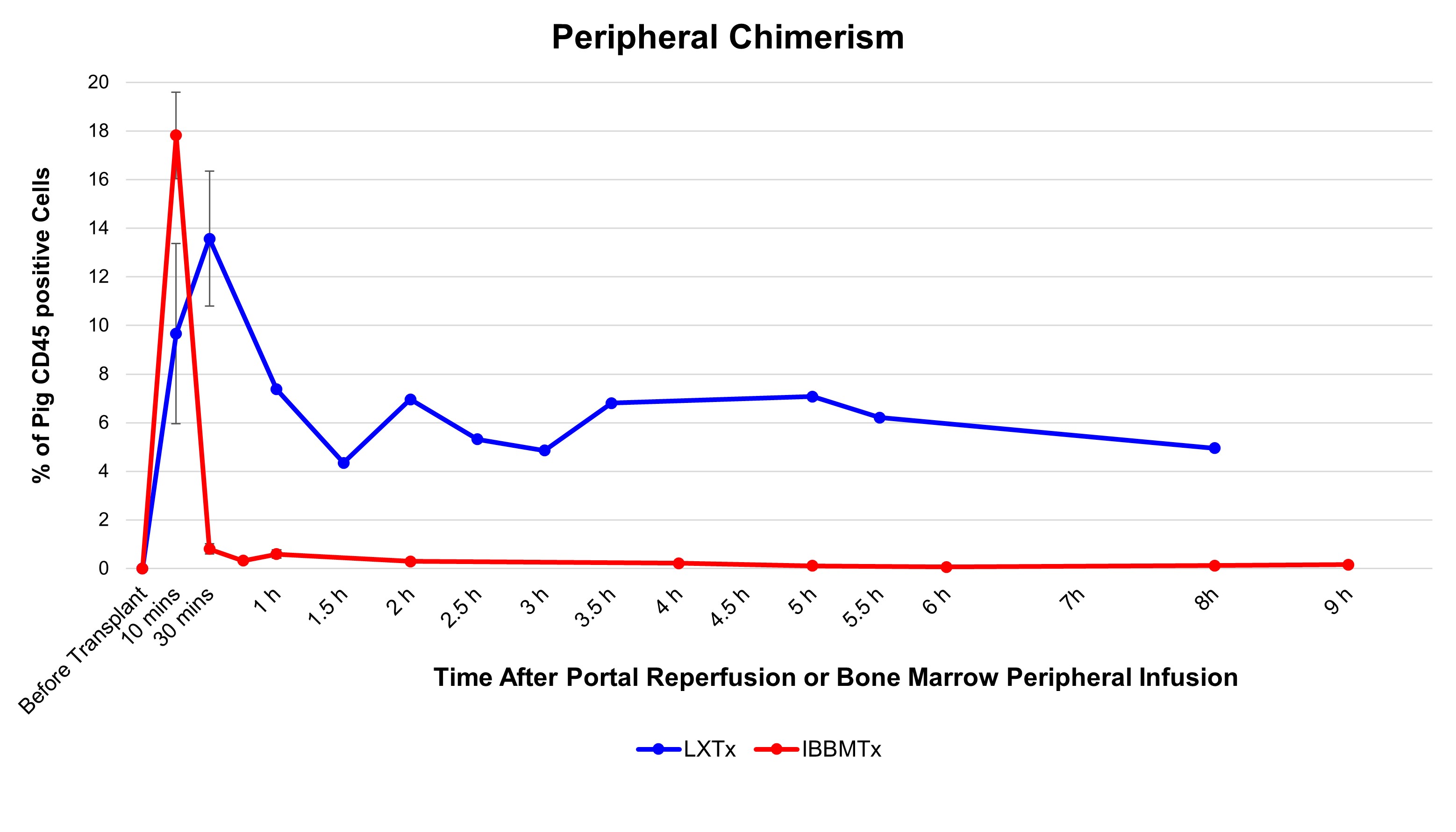 Conclusion: Our study demonstrates that spontaneous xenogeneic mixed chimerism is achievable in a pig-to-baboon LXTx model. Chimerism persisted for at least 8 hours following portal vein reperfusion and from 30 minutes after reperfusion continued to be higher compared to that observed in IBBMTx. Immunosuppressive protocols designed to support this spontaneous mixed chimerism could potentially enhance graft survival. Our findings may suggest insights into chimerism in xenotransplantation and highlight opportunities for optimizing immunosuppressive strategies to improve long-term LXTx outcomes.