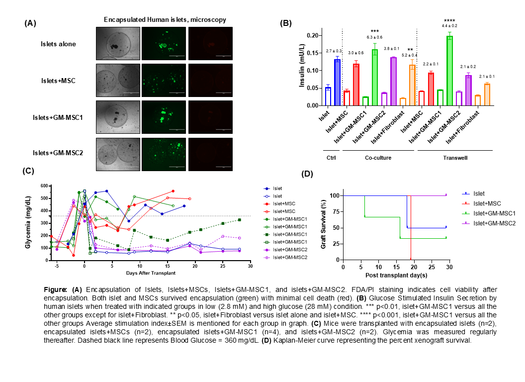 Method: MMP-9 overexpression was achieved in MSCs by two different approaches, GM-MSC1 and GM-MSC2, with 6,000-fold and 15-fold increase in MMP-9, respectively. Overexpression of MMP-9 in modified MSCs was confirmed by qPCR and ELISA. We studied the effects of MSCs and modified MSCs on pancreatic islet function and survival in vitro and in vivo. Islet Insulin secretion was evaluated in vitro by measuring glucose-stimulated insulin secretion (GSIS). Islet morphology and viability were assessed over time using FDA/PI staining. Diabetes was induced in C57BL/6 mice by intraperitoneal injection of streptozotocin (STZ) at 220 mg/kg. Diabetes was defined as glycemia levels >360 mg/dL. Encapsulated human islets were xenotransplanted intraperitoneally in diabetic mice within groups: islets alone, islets+MSCs, islets+GM-MSC1, and islets+MSC2. Blood glucose level was monitored twice a week for each mice group. Islet xenograft failure was concluded when glucose level was >360 mg/dL for three consecutive measurements.