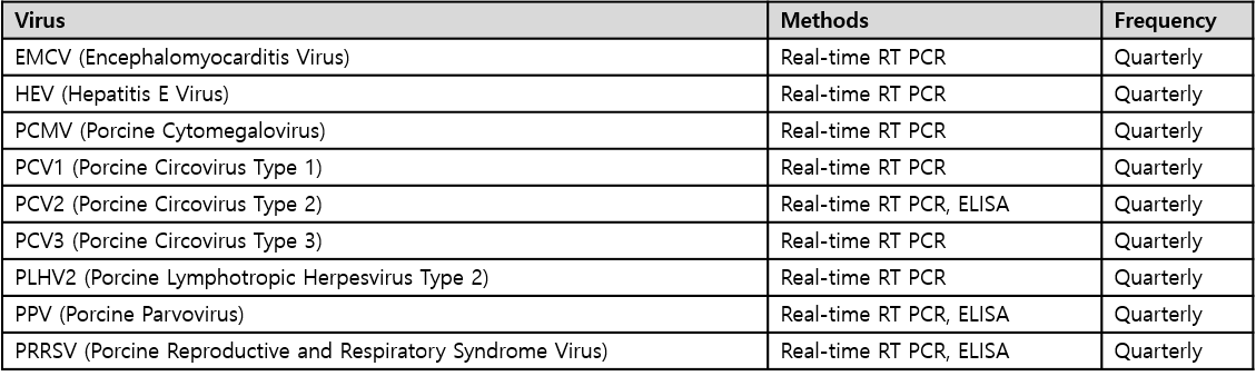 We have established and are currently operating a DPF facility for breeding miniature pigs for xenotransplantation. In accordance with the guidelines from the Ministry of Food and Drug Safety (MFDS) in Korea, we have developed analytical methods for a total of 148 pathogens, including 40 species of bacteria, 8 species of fungi, 13 species of parasites, 13 species of protozoa, and 74 species of viruses, to DPF transgenic pigs, the source animals for xenotransplantation