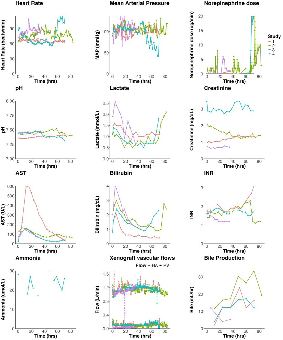 Methods: Four brain-dead research donors (‘decedents’) underwent ELC using porcine livers (EGEN-5784) with the following genetic modifications: (i) triple glycan knockout; (ii) hemizygous insertion of seven human transgenes; (iii) functional inactivation of porcine endogenous retrovirus pol gene. Immunosuppression comprised intravenous methylprednisolone.