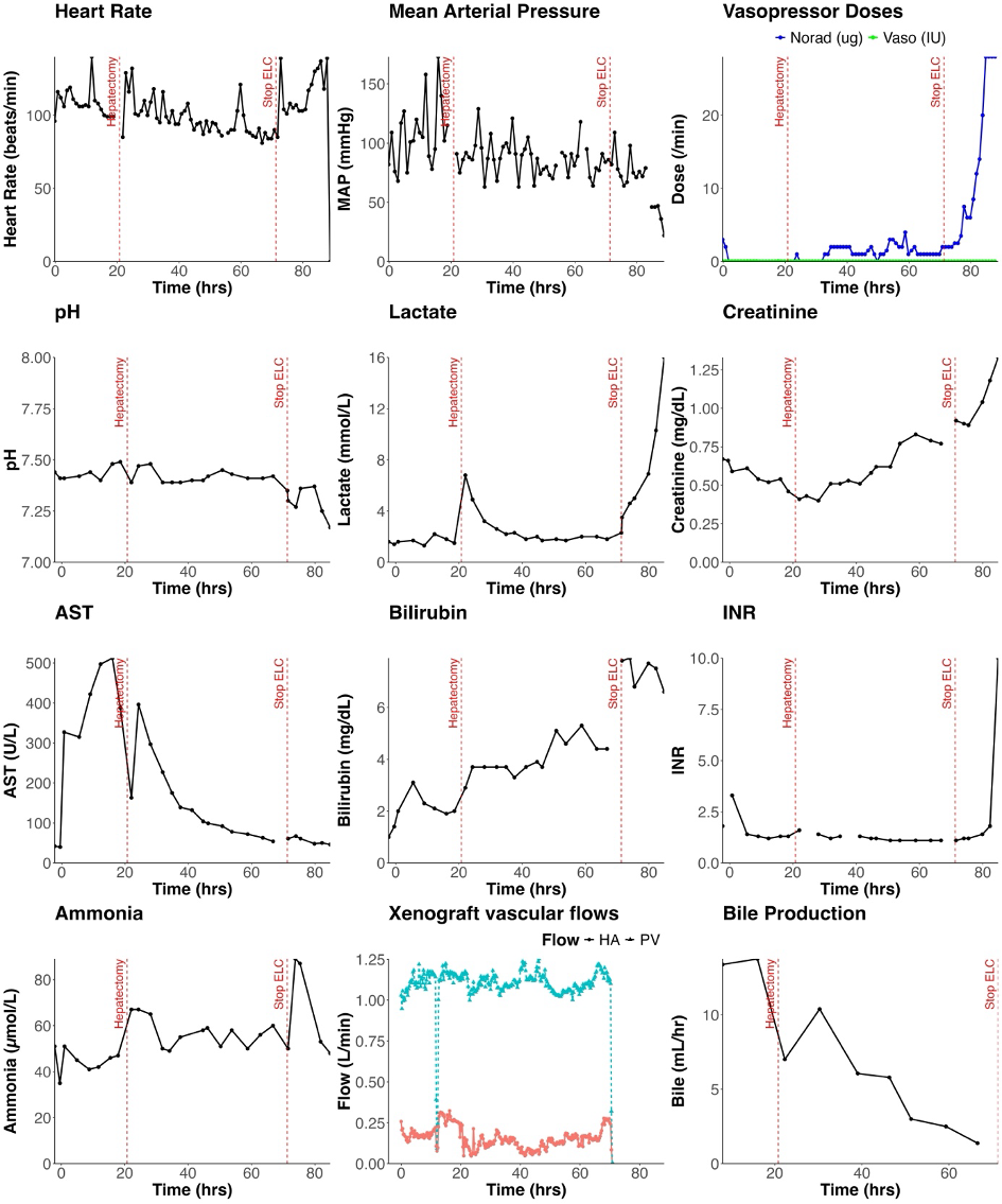 Post-native hepatectomy, ELC maintained Decedent 4 with minimal inotrope requirement, and normal lactate, pH, base excess, INR and ammonia: this persisted until elective termination of ELC 48 hours post-hepatectomy.