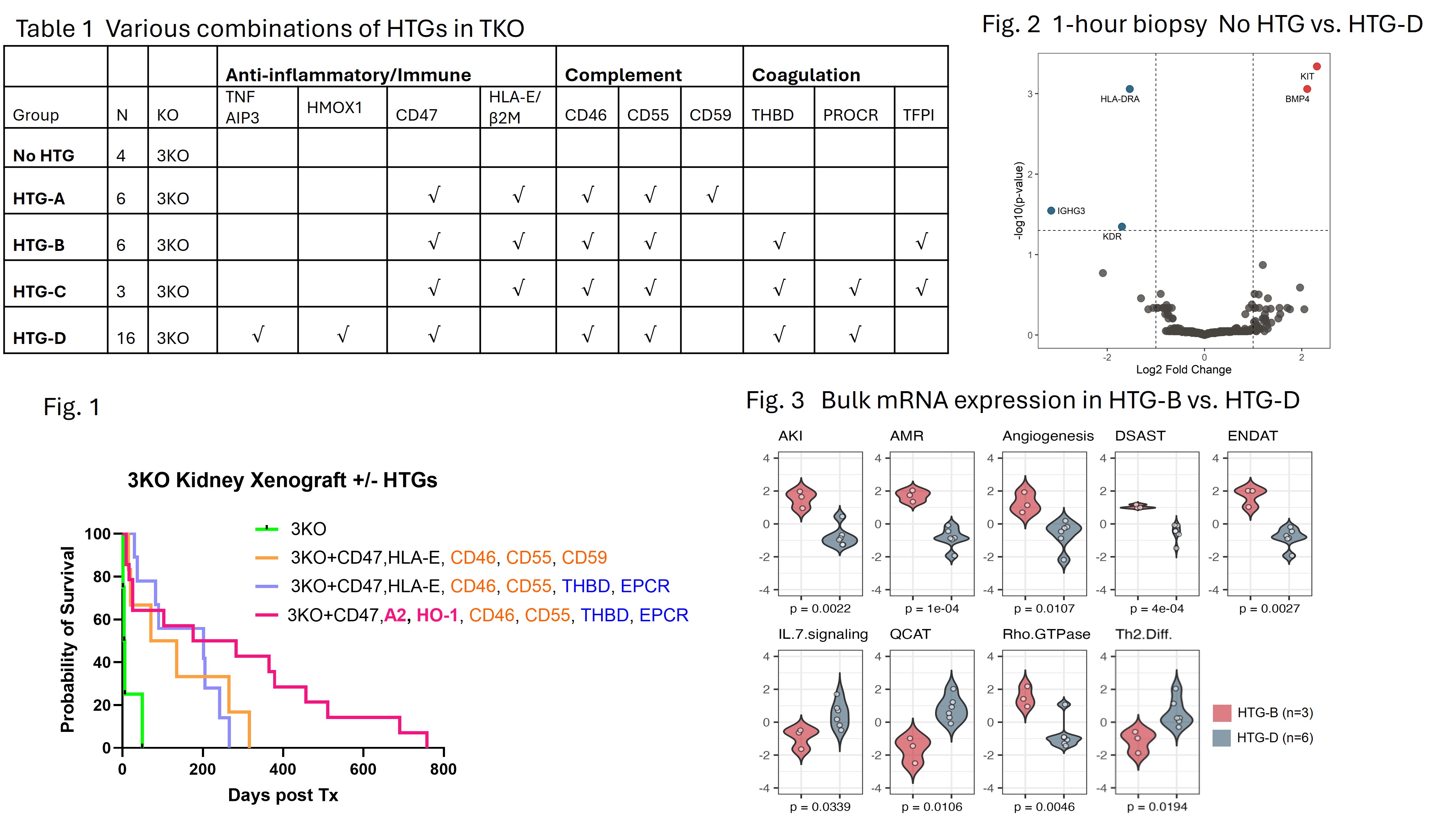 Methods: Kidney xenografts from gene edited pigs with 3KO alone (No HTG) or 3KO with various combinations (Table 1) were transplanted to cynomolgus monkeys. All recipients were treated with an immunosuppressive regimen, that included rituximab (20mg/kg on day -5) and ATG induction, followed by anti-CD154 (20mg/kg weekly) and mycophenolate mofetil (MMF) and 60 day-course of tacrolimus and steroids.