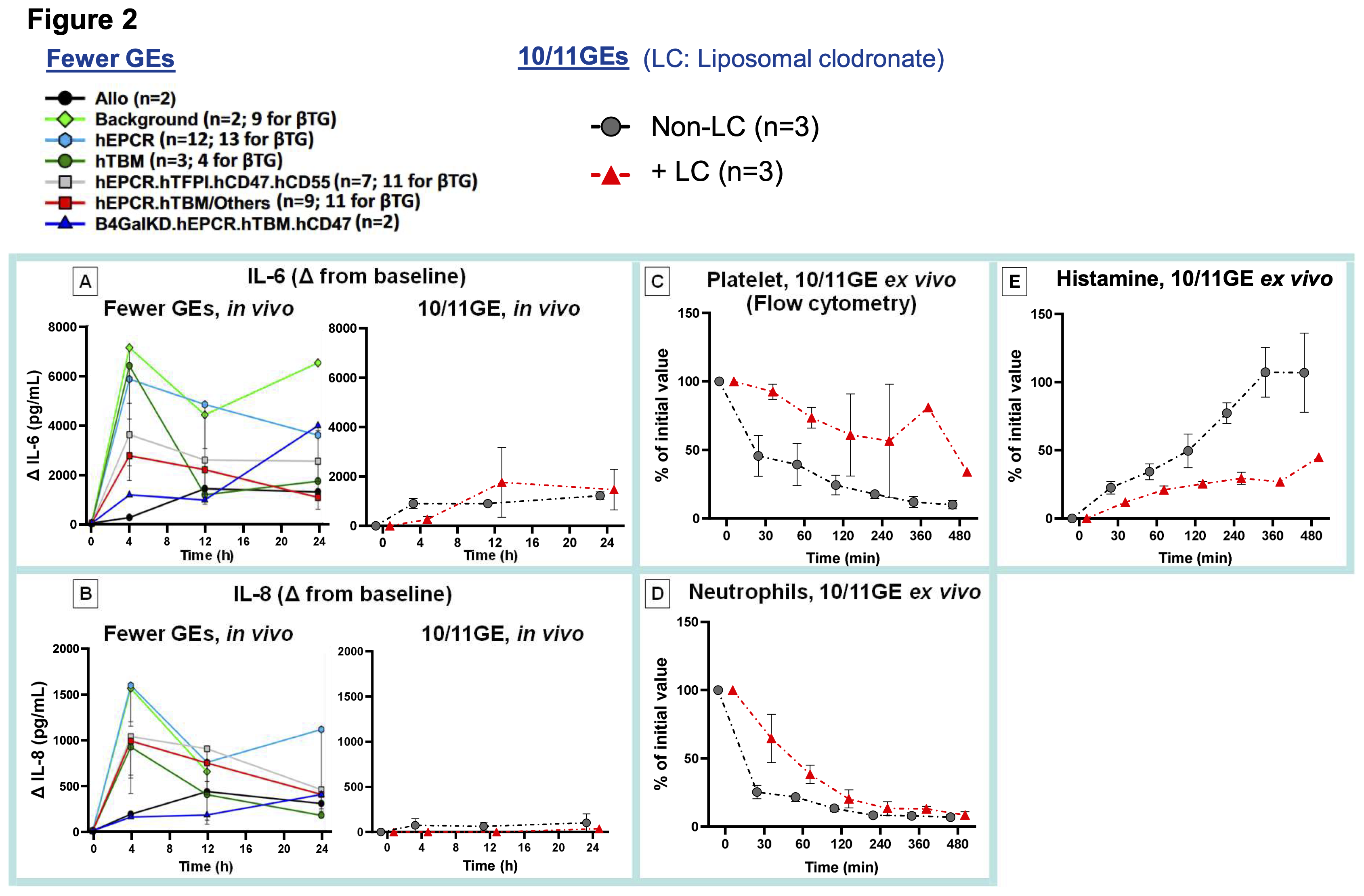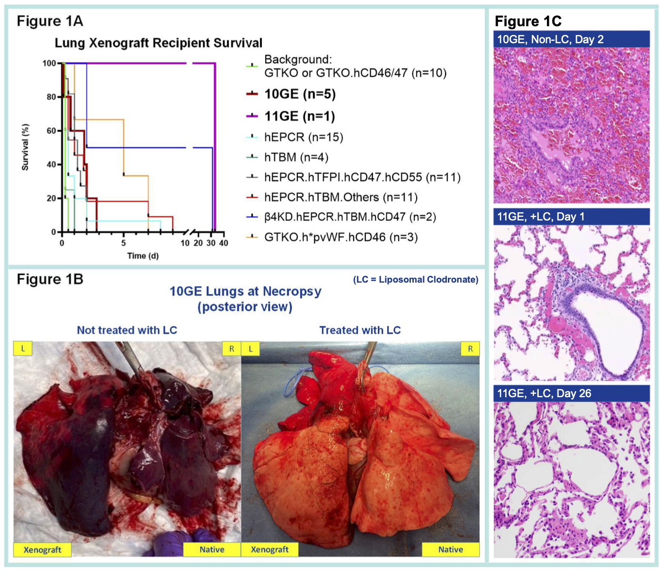 Results: The 11GE lung survived 33 days, and 10GE lung survivals were 1 to 3 days in vivo (Figure 1A) and >8 hours ex vivo. 10GE lung failure in vivo was primarily due to loss of vascular barrier function despite markedly reduced levels of IL-6 and IL-8 compared to reference GE lungs (Figure 2A-B). LC-lungs had less severe parenchymal damage in vivo (Figure 1B). Histopathology confirmed extensive inflammation, diffuse hemorrhage, and microthrombosis in non-LC 10GE lungs; in contrast, the 11GE+LC lung showed only mild inflammation at POD 1 and preserved alveolar structure and airway epithelium at POD 26 (Figure 1C). Ex vivo, neutrophil and platelet sequestration were delayed, and histamine levels were reduced relative to non-LC lungs (Figure 2C-E).