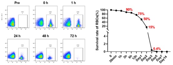 RBCs from TKO pigs expressing human CD55 (housed under pathogen-free conditions) were labeled with CFSE for tracking. A single brain-dead human subject received a transfusion of GE pRBCs, with pre-transfusion treatments including an anti-C5 inhibitor, corticosteroids, and antihistamines. Monitoring included continuous vital sign tracking, hematological and immunological assessments, complement activation assays, and pathogen screening.