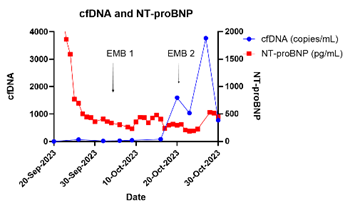 Methods/Approach: NT-proBNP was checked periodically and dd-cfDNA was assessed once to twice weekly post-transplant. A retrospective review was completed including Pearson’s correlation coefficient analysis.