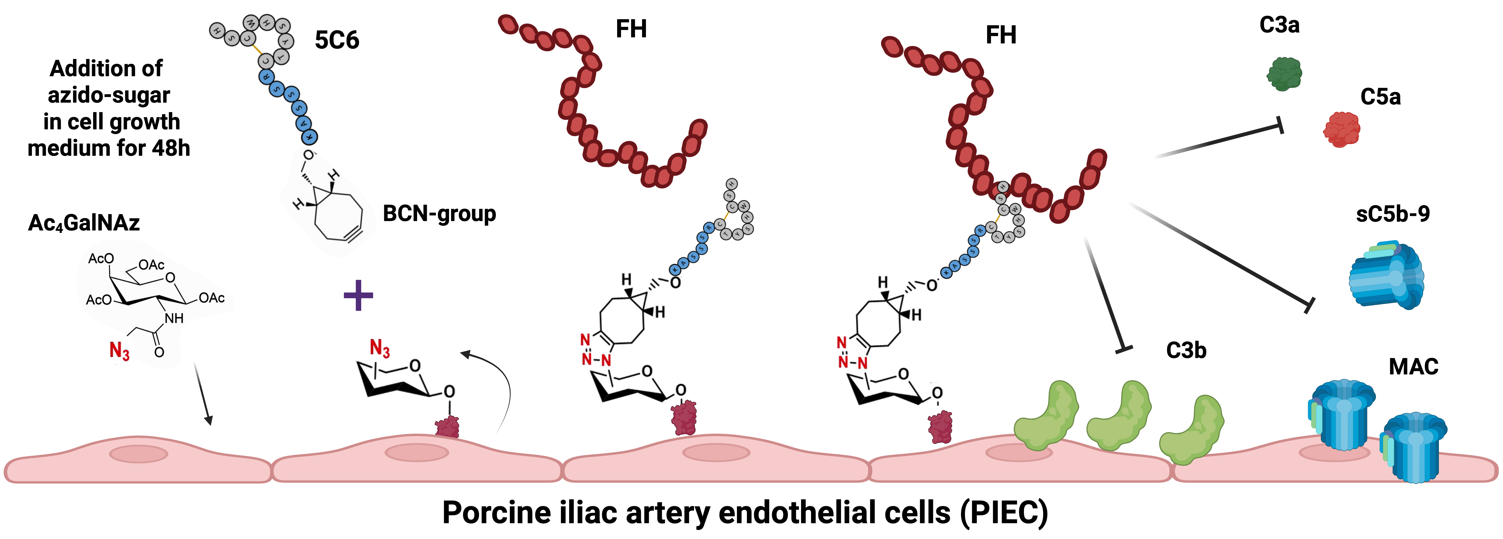 Methods: We developed a coating approach for endothelial cell models by integrating metabolic glycoengineering with bioorthogonal click chemistry. Porcine iliac artery endothelial cells (PIECs), relevant to xenotransplantation applications, were cultured in the presence of azide-modified monosaccharides to introduce reactive azide groups onto cell-surface glycans. This enabled the covalent attachment of an alkyne-functionalized peptide (5C6) that specifically recruits the physiological complement regulator factor H (FH; Fig.1A). The surface distribution of azides, coated peptides, and recruited FH was monitored by fluorescence microscopy and functional efficacy by measuring opsonization upon serum exposure.