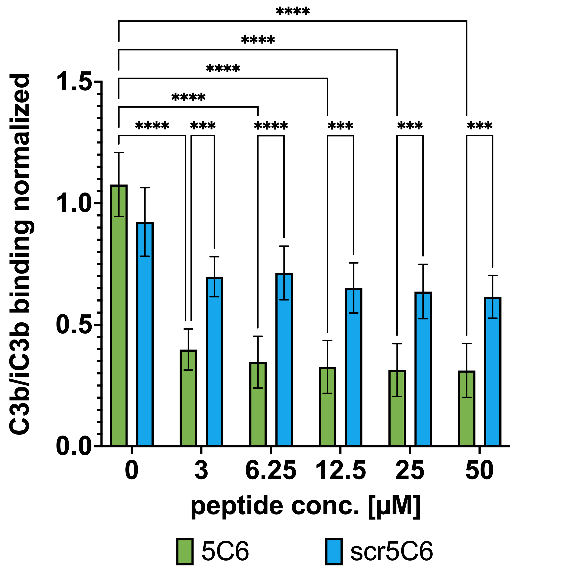 Figure 1. (A) Coating approach to provide complement control via regulator recruitment. Incubation of endothelial cells in Ac4GalNAz-supplemented culture medium leads to the incorporation and presentation of azido-groups on the glycocalyx. This allows the covalent coupling of a clickable 5C6 derivative to azide-bearing glycans via a triazole bridge. 5C6-coating of cell surfaces enables the recruitment of endogenous FH, downregulating opsonization with C3b, MAC formation, and the release of anaphylatoxins (C3a, C5a). (B) Complement downregulation was evaluated in 50% Mg2EGTA serum using different concentrations of peptides 5C6 and scr5C6 (scrambled negative control). Bars indicate the mean of the replicates; error bars indicate standard deviation, ****: significant (p ≤ 0.0001).