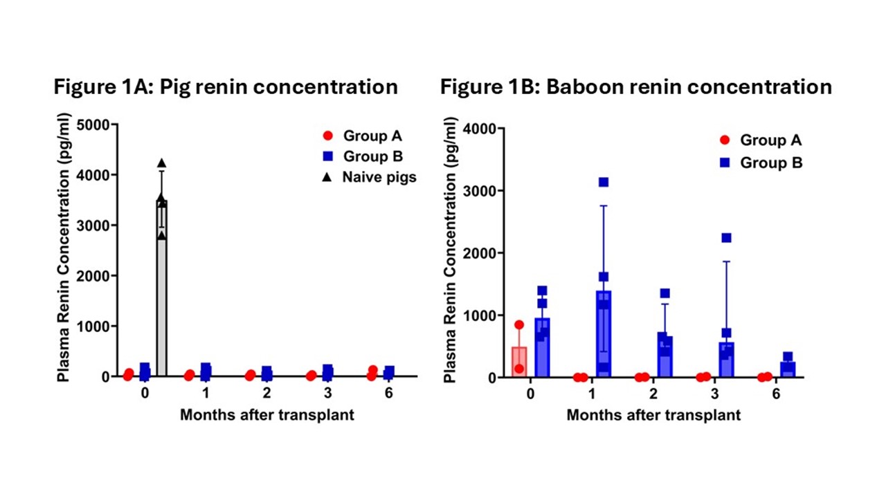 Results: The immunosuppressive regimen supported graft survival >1 year (n=2), >6 months (n=2), and >3 months (n=2). Group A exhibited features of dehydration: e.g., increasing Cre levels (requiring weekly, bi-, or tri-weekly normal saline administration) and higher potassium levels. Group B maintained normal Cre levels without fluid support. Naive pigs showed positive pig renin, but pig renin was undetectable at all post-transplant time-points in both groups (Figure 1A). Baboon renin concentration was measurable only in Group B (Figure 1B), indicating that the remaining kidney contributed to renin production. Group B showed higher baboon renin concentrations and activity than Group A, resulting in elevated angiotensin I, which indicated that angiotensinogen was cleaved by baboon renin. There were no differences in antiotensinogen or aldosterone levels between groups.