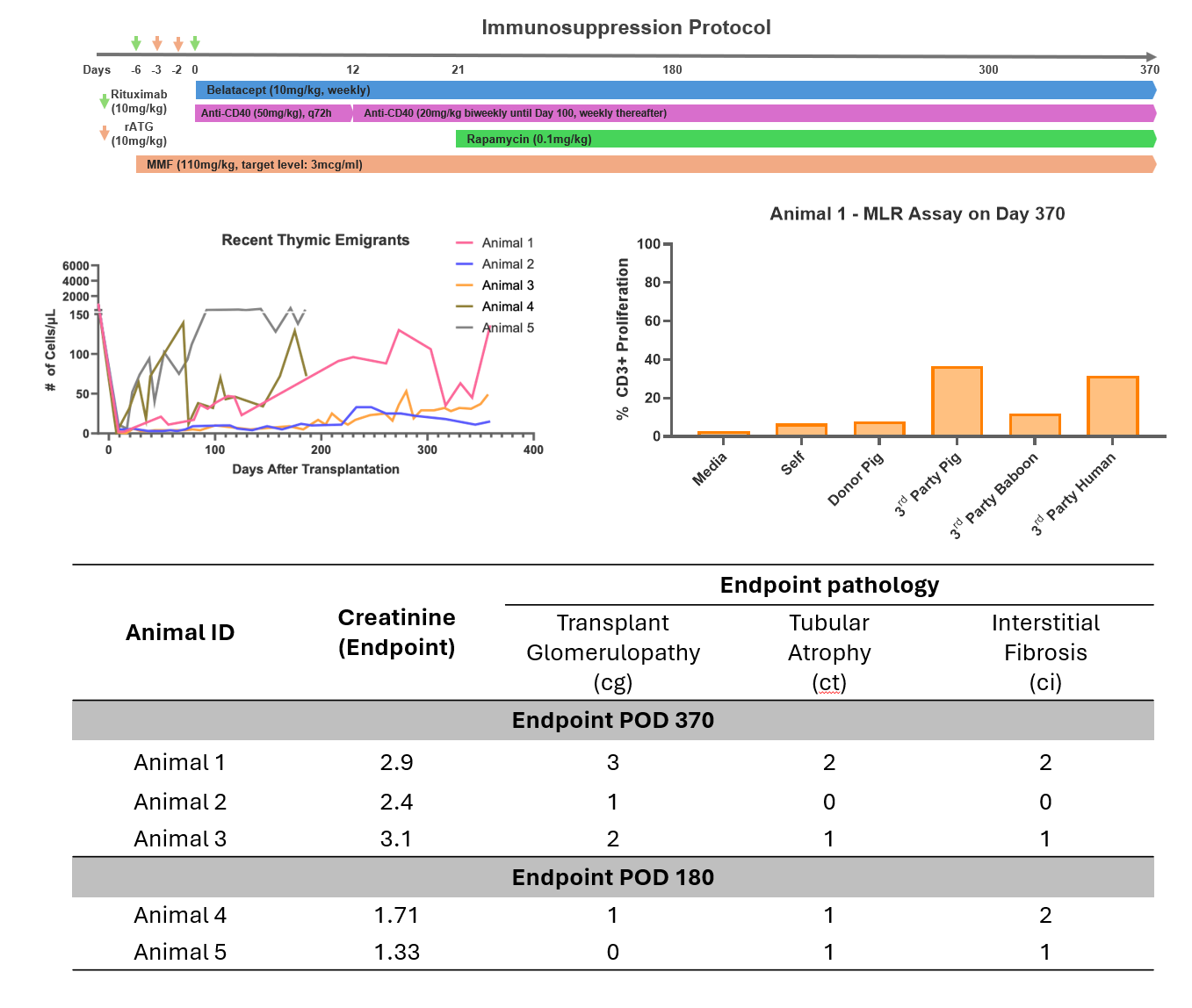 Methods: Recipient baboons (n=5) with low natural non-Gal antibodies underwent total thymectomy and induction therapy with rATG and rituximab. On day 0, they underwent bilateral nephrectomy and splenectomy and received transplants of TK grafts from inbred GalT-KO miniature swine. Immunosuppression (IS) included MMF, rapamycin, anti-CD40 mAb, and Belatacept. Kidney function was assessed through biochemical analyses and biopsies. Donor-specific antibodies (DSA) and absolute T-cell, B-cell, and recent thymic emigrant (RTE) counts were monitored. Mixed lymphocyte reaction (MLR) assays were performed monthly.