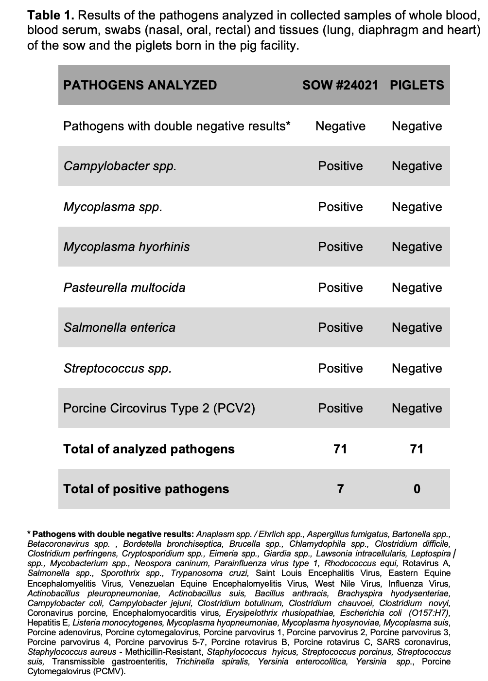 Results: The sow was positive for 7 pathogens (Campylobacter spp., Mycoplasma spp., Mycoplasma hyorhinis, Pasteurella multocida, Salmonella enterica, Streptococcus spp., and PCV2). The piglets were negative for all the evaluated pathogens (Table 1). None of the pathogens tested in the PF environment were detected (Table 2).