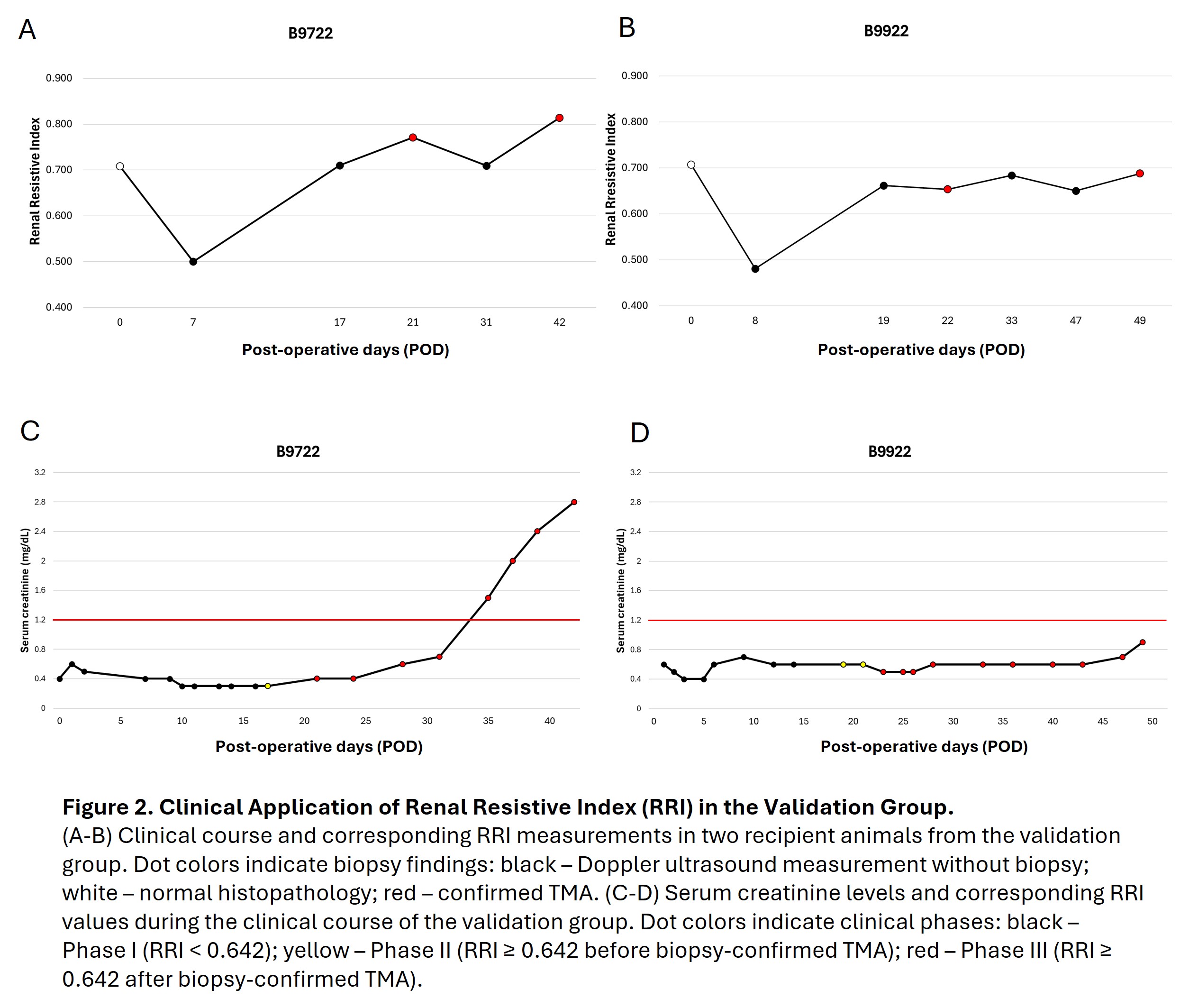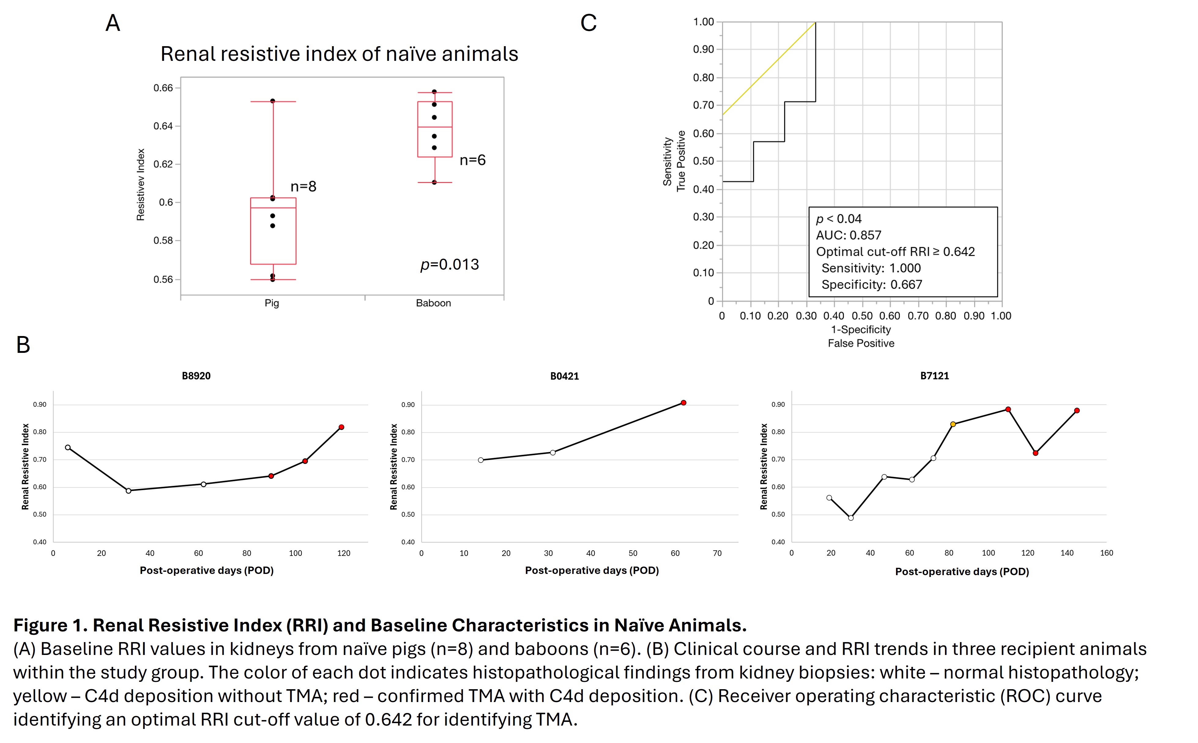 Results: Baseline RRI values were significantly lower in the kidneys of naïve pigs compared to naïve baboons (median [IQR]: 0.597 [0.568–0.603] vs 0.640 [0.624–0.653], respectively; p<0.02). In the study group, elevated RRI values were observed at the time when TMA was confirmed by biopsy (median [IQR]: 0.820 [0.696–0.883] vs 0.628 [0.575–0.717], respectively; p<0.02). The optimal RRI cut-off value associated with TMA following KXTx was 0.642 (ROC AUC=0.857, p<0.04), with a sensitivity of 1.000 and specificity of 0.667.