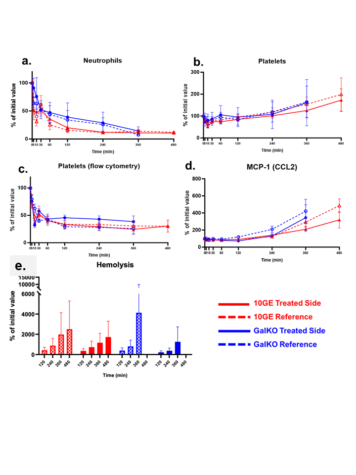 Results: The combined treatment delayed but didn’t prevent neutrophil and platelet sequestration. MCP-1 levels were lower, and RBC fragments and free Hgb were reduced in treated GalKO and 10GE lungs at 4hrs of perfusion compared to controls (Fig 1a-e)