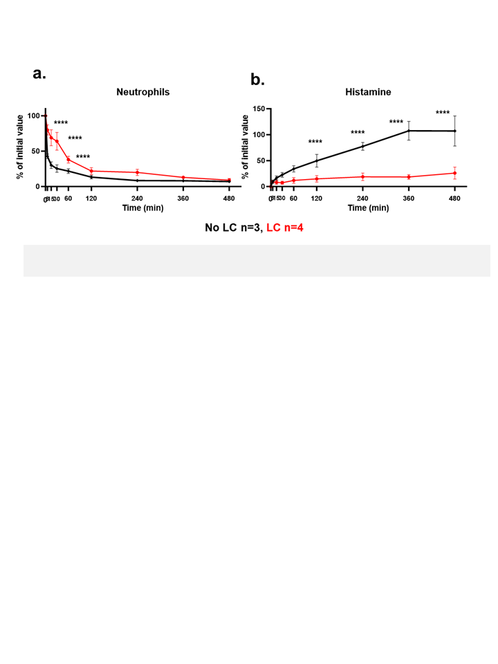 Lungs from LC-treated pigs showed significantly lower neutrophil sequestration during the first 60 minutes and lower histamine levels throughout the perfusion compared to other 10GE lungs (Fig 2a-b).