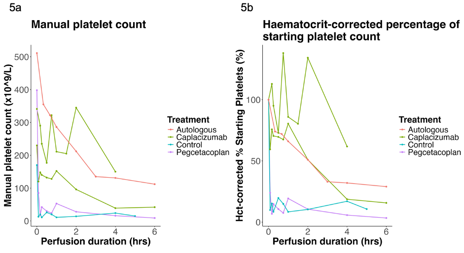 To assess the mechanism of early xenograft-associated thrombocytopenia, a further four livers (3KO.7TG.RI: n = 4) underwent 4-6-hour xenoperfusion under three different conditions: (i) control: standard normothermic liver perfusion (n=1), (ii) capalacizumab pre-treatment (von Willebrand factor inhibitor) (n=2), and (iii) pegcetacoplan pre-treatment (complement C3 inhibitor) (n=1). A single whole blood autologous wild-type pig liver perfusion was used as an ‘autoperfusion’ control.