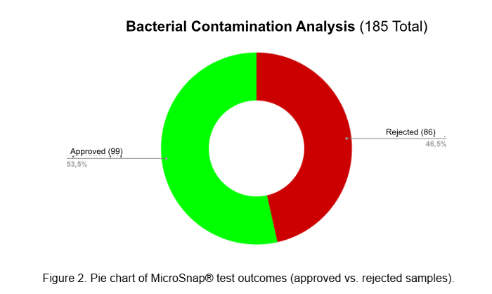 While the majority of samples met safety thresholds (CFU <10; B/A <0.9), a subset revealed contamination (e.g. Staphylococcus coagulase negativa, Micrococcus spp. and elevated ATP signals on laboratory surfaces), prompting immediate corrective actions including retraining and protocol revision.
