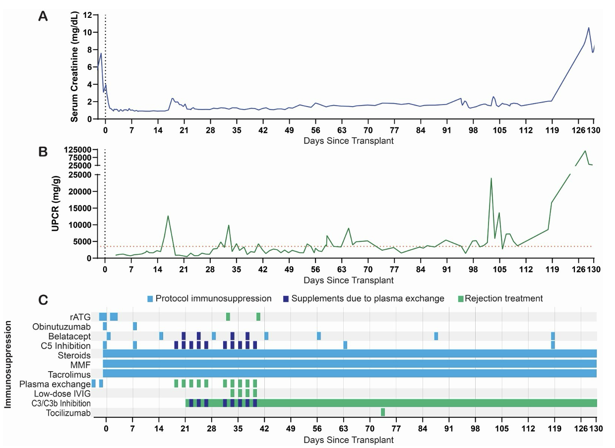 Results: Immediate graft function was evidenced by a mean serum creatine (sCr) and urinary protein-to-creatinine ratios (UPCR) of 1.2 mg/dL and 1.4 g/g, respectively, for the first two weeks post-transplant. UPCR increased to 12.7 g/g along with a rise in IgG and IgM on flow crossmatch. A biopsy performed on POD 17 demonstrated glomerulitis, peritubular capillaritis, diffuse C4d staining (Banff g2 t0 i0 ptc0-1 v0 c4d3, cg0 ct0 mm2 ci0 ti0 cv0 ah0 i-ifta0), C3 deposition in the glomeruli, and 90% podocyte foot process effacement. The AMR treatment plan included 10 plasmapheresis sessions, low dose IVIG, C3/C3b complement inhibitor, and 3 mg/kg rATG. POD 57 and 85 biopsies confirmed absence of AMR and resolution of foot process effacement. On POD 73 the patient was administered IL-6 receptor blockade for a monocyte rich transcriptomics signature on POD 57 biopsy. Following the establishment of histologic immunologic quiescence the patient was started on anti-proteinuric agents to lower her still-present nephrotic range proteinuria. Unfortunately, despite these agents the patient remained with proteinuria that averaged 5.8 ± 5.8 g/g daily. She continued to maintain excellent xenograft function, however, with a stable sCr of 1.59 ± 0.32 mg/dL that increased to 2.06 mg/dL once fully optimized on anti-proteinuric agents. The development of two severe soft tissue infections of the skin, the second of which was accompanied by gram-negative bacteremia prompted the cessation of IL-6 receptor blockade and a reduction in calcineurin inhibitor goal by 50%. The patient was maintained on mycophenolate mofetil, prednisone, belatacept, and complement inhibition. On POD 125, the patient was noted to have a rise in sCr from a baseline of 2.05 mg/dL to 3.99 mg/dL. Her kidney function continued to rapidly decline, with sCr peaking at 10.56 mg/dL. POD 128 biopsy demonstrated loss of normal renal architecture and extensive, severe interstitial hemorrhage. The patient underwent explant on POD 130 and returned to dialysis.